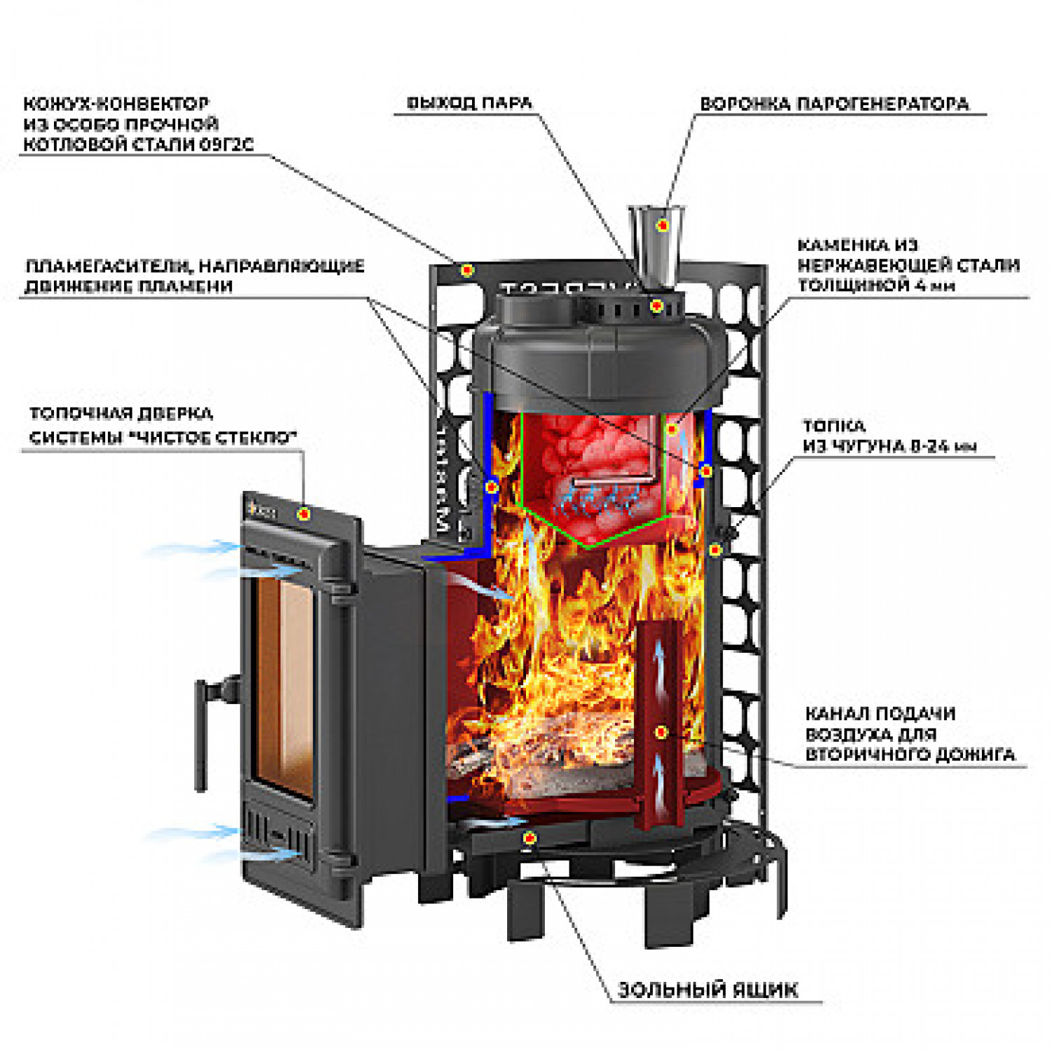Закрытая каменка сделана из нержавейки с толщиной стенок 4 мм и дна 6 мм. Она окутывается огнем со всех сторон, благодаря чему камни нагреваются свыше 550℃. Это позволяет получать много легкого и мягкого пара.