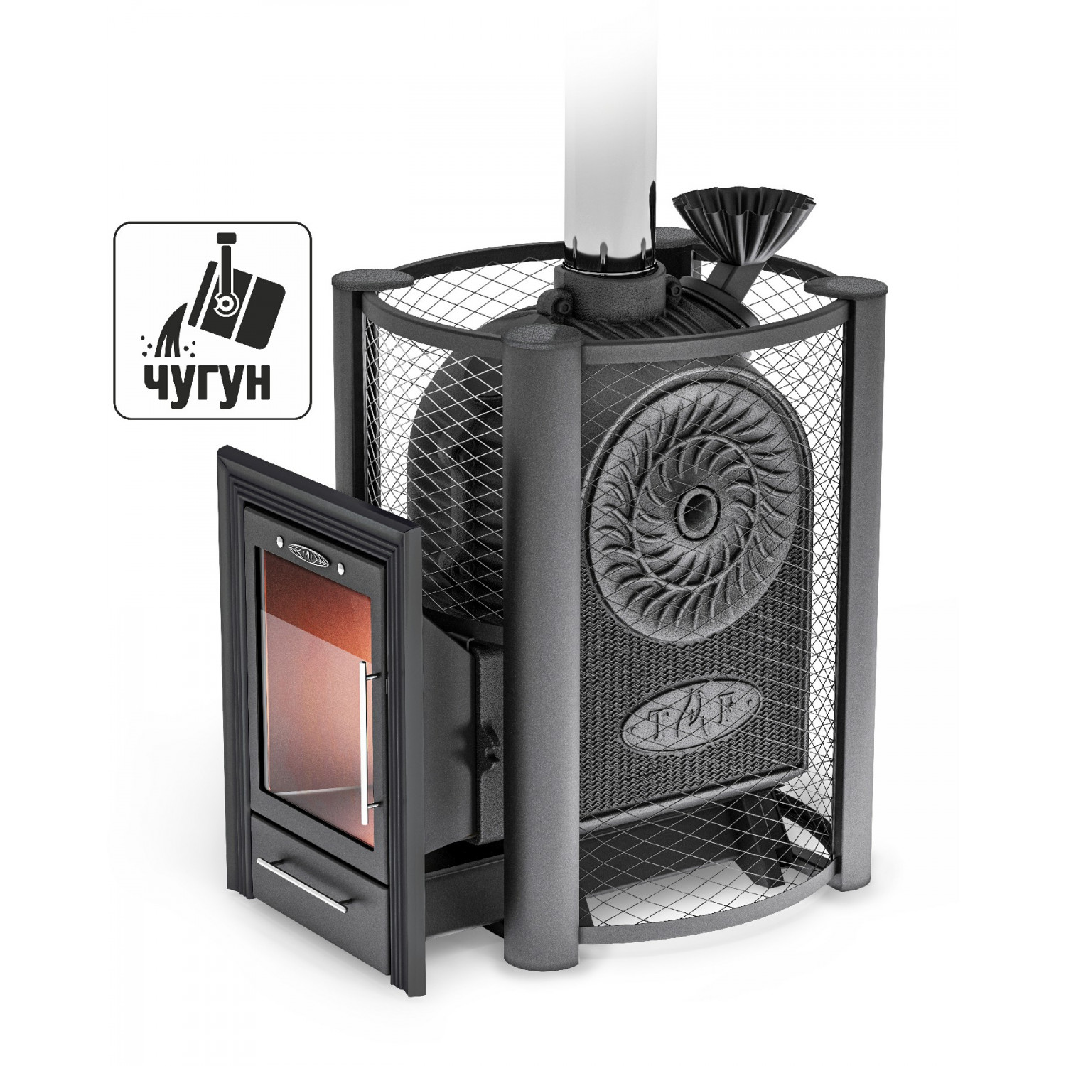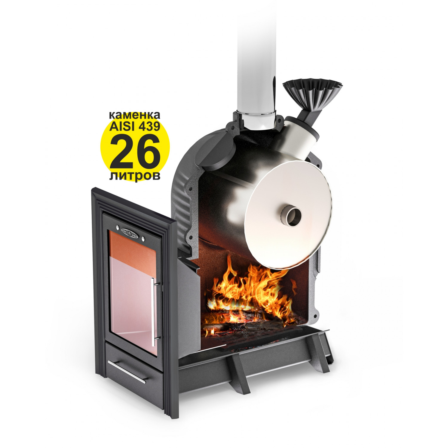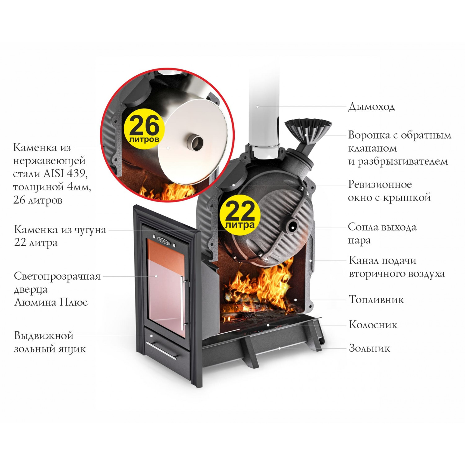 Чугунная печь для русской паровой бани с внутренней закрытой каменкой из нержавеющей стали. От других чугунных печей эту печь отличает, прежде всего, очень большой объем внутренней закрытой каменки, более половины поверхностей которой нагреваются тепловым излучением от пламени, и относительно небольшой объем топки для исключения перегрева парной.