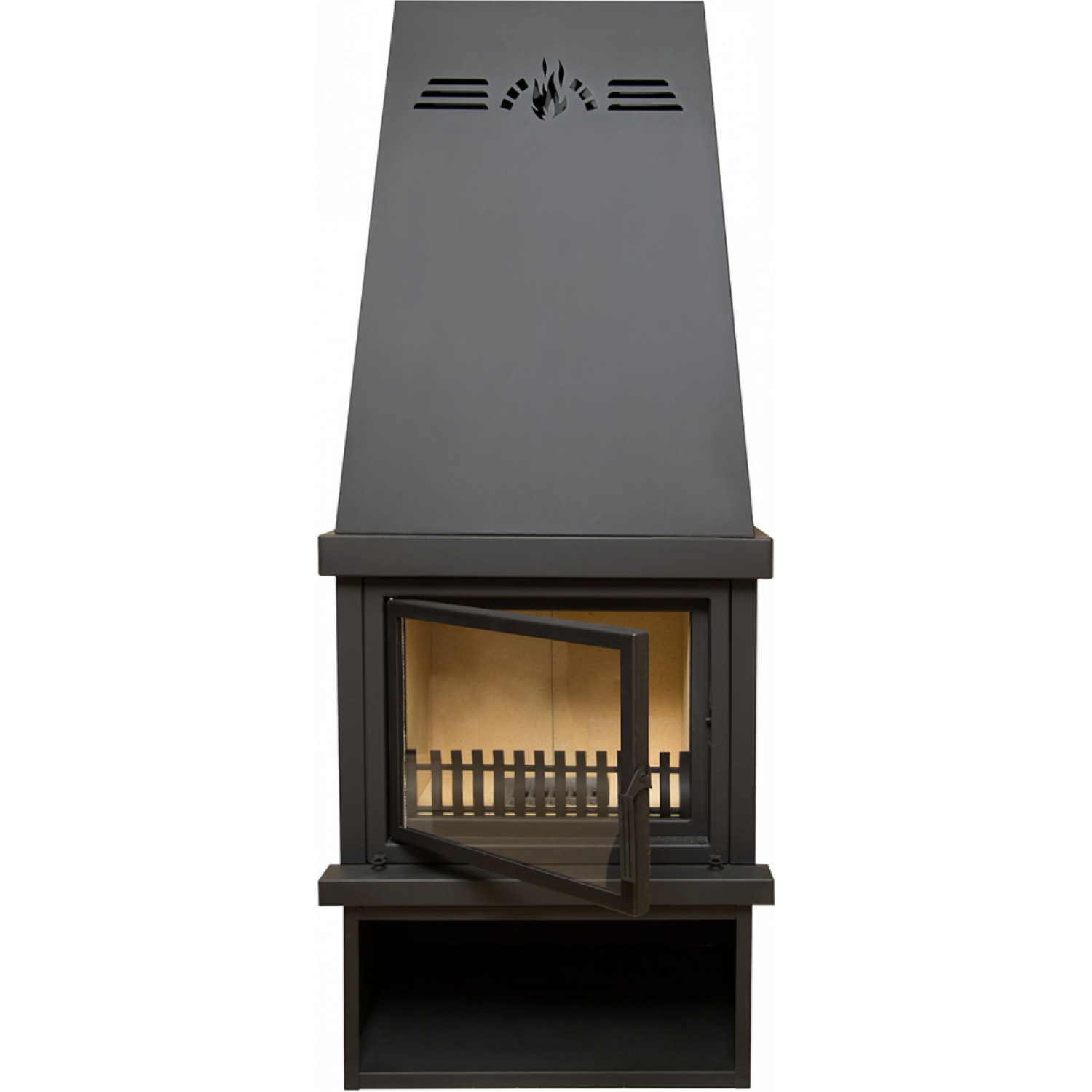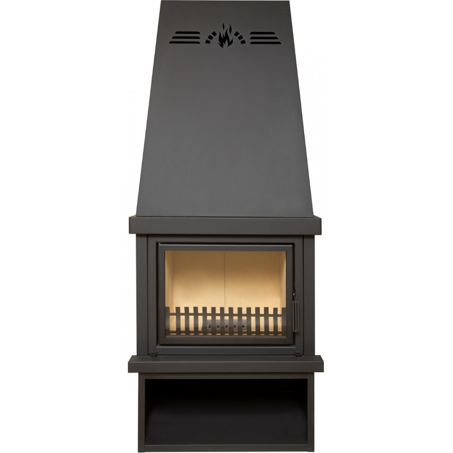 - Топочная камера изготовлена из стали, защищенной шамотными плитами. Спереди топка ограничена изящной решеткой, предохраняющей поленья от смещения и выпадения наружу, а стекло - от повреждений. Дверца с большим жаростойким стеклом, выдерживающим температуру до 900 градусов, открывается вбок. Стеклянная поверхность остается чистой благодаря обдуву теплым воздухом - он препятствует оседанию сажи и копоти.