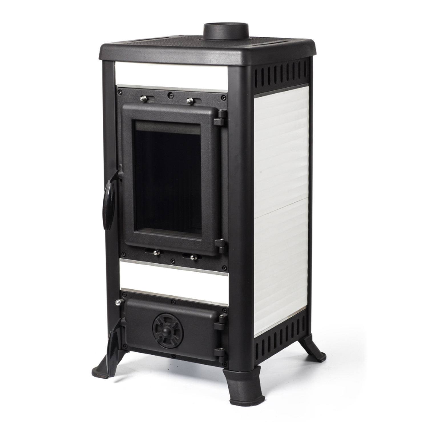 Тепловая мощность печи 8 кВт. КПД 75%. Систем длительного горения, работа в режиме тления до 8 часов. Система обдува стекла. Система сброса золы с колосник. Загрузка дров фронтальная.Диаметр дымохода 120 мм. Расположение дымохода сверху. Отделка антрацит с керамическими вставками белого цвета. Размер стекла 315х223х4 mm. Размер упаковки ДхШхВ: 540х510х950 mm. Гарантия 5 лет.