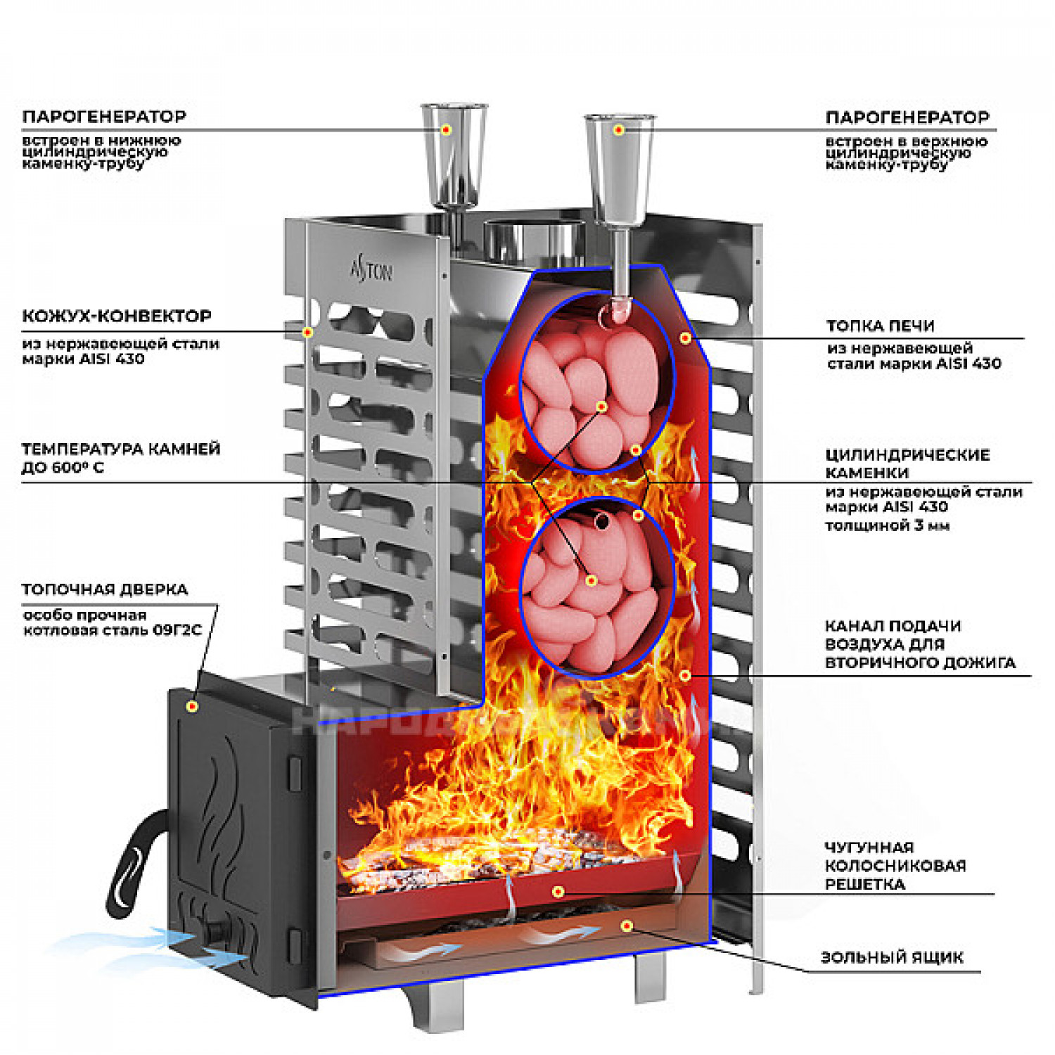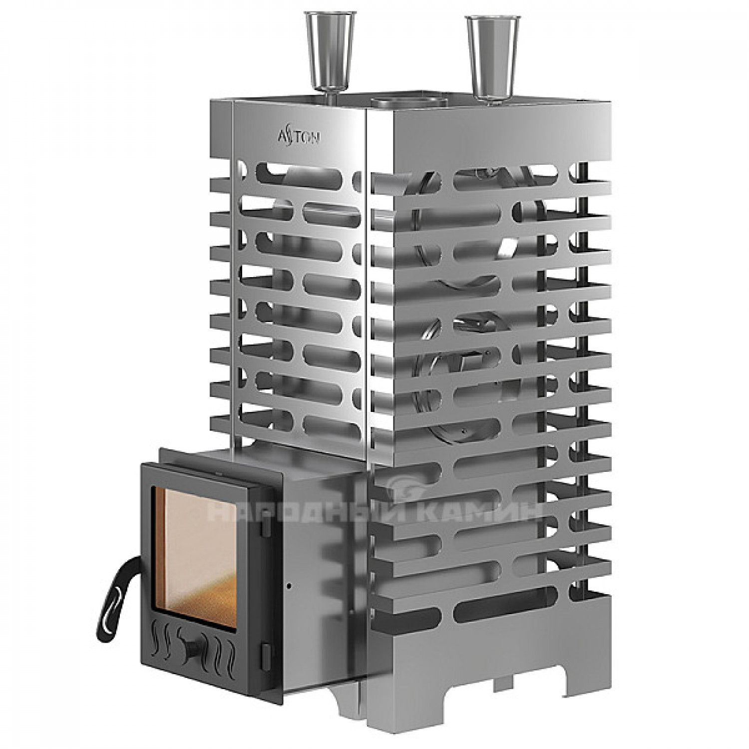 Сетка-каменка из нержавейки обрамляет топку и вмещает в себя 80-90 (+ 30) кг. камней. Также у АСТОН есть внутренняя закрытая каменка, подача воды в которую осуществляется через воронку, вынесенную наверх. Такая каменка позволяет получать легкий и мягкий пар.