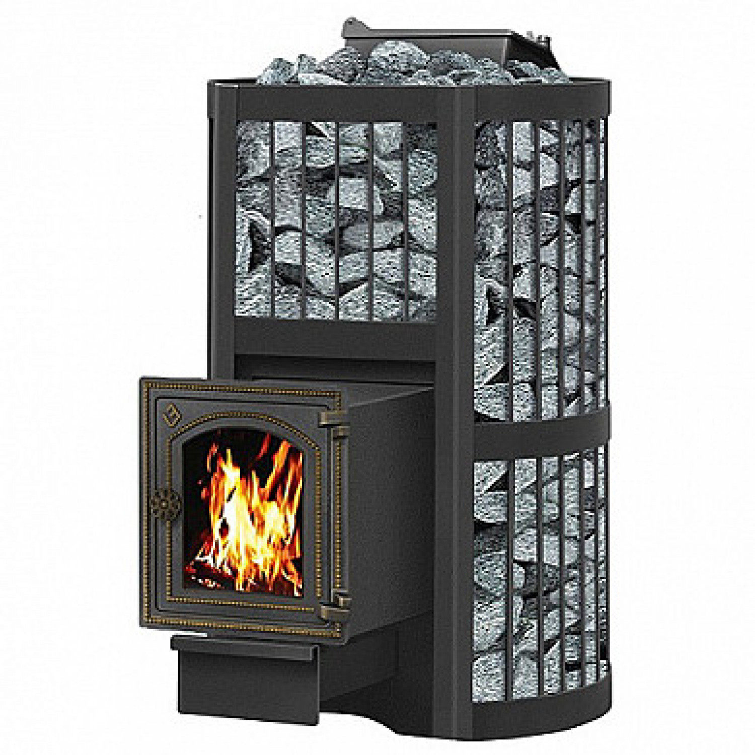 Совокупно в открытую и закрытую каменки помещается около 220 кг. камней.