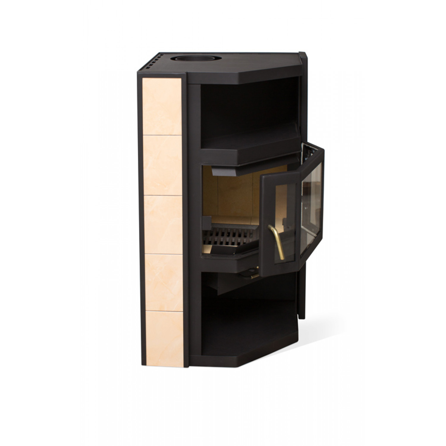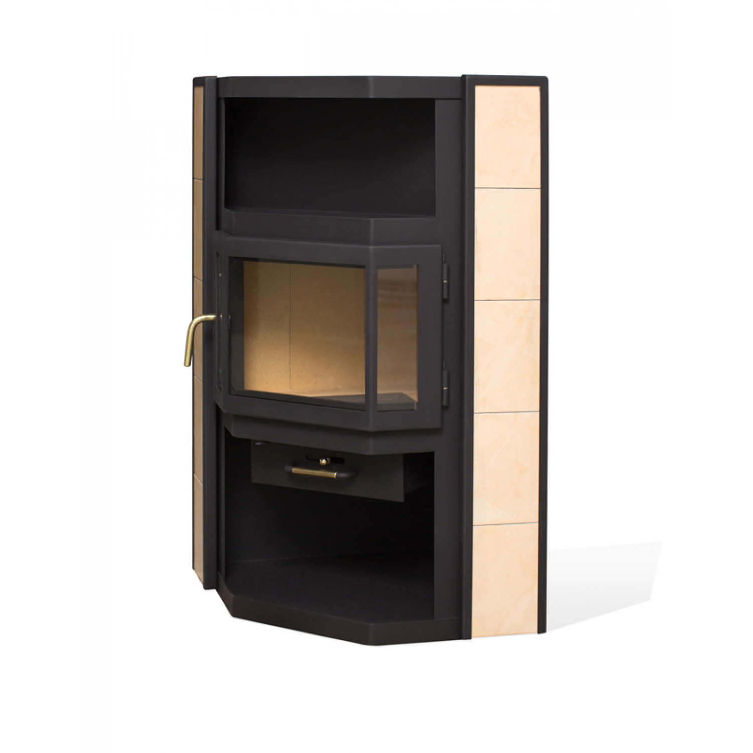 “Амур” - это объемная печь-камин, рассчитанная на обогрев помещения площадью до 90 кв. метров. Печь выполнена в классическом стиле: прямые линии, корпус, покрытый жаростойкой эмалью глубоко черного цвета, призматическое остекление дверцы. Светлая керамическая плитка по бокам и объемные открытые ниши сверху и снизу визуально облегчают печь.