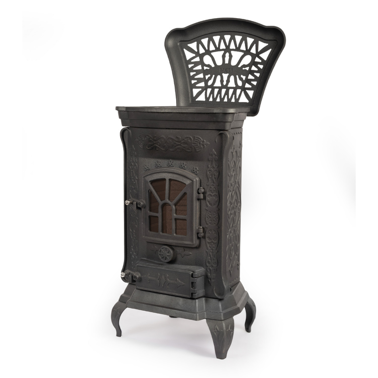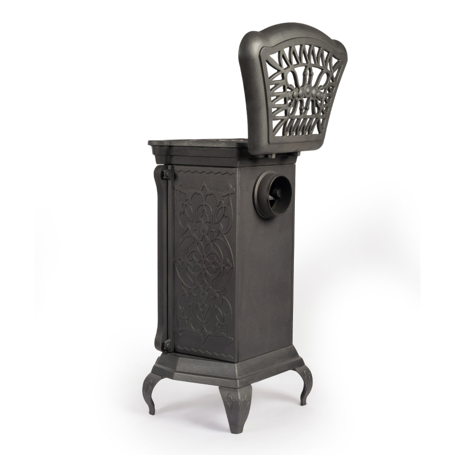 - Верхняя панель печи представляет собой варочную поверхность. Она сплошная, поэтому попадание дыма в помещение в процессе эксплуатации прибора исключено. Сверху панель закрывается ажурной чугунной крышкой.