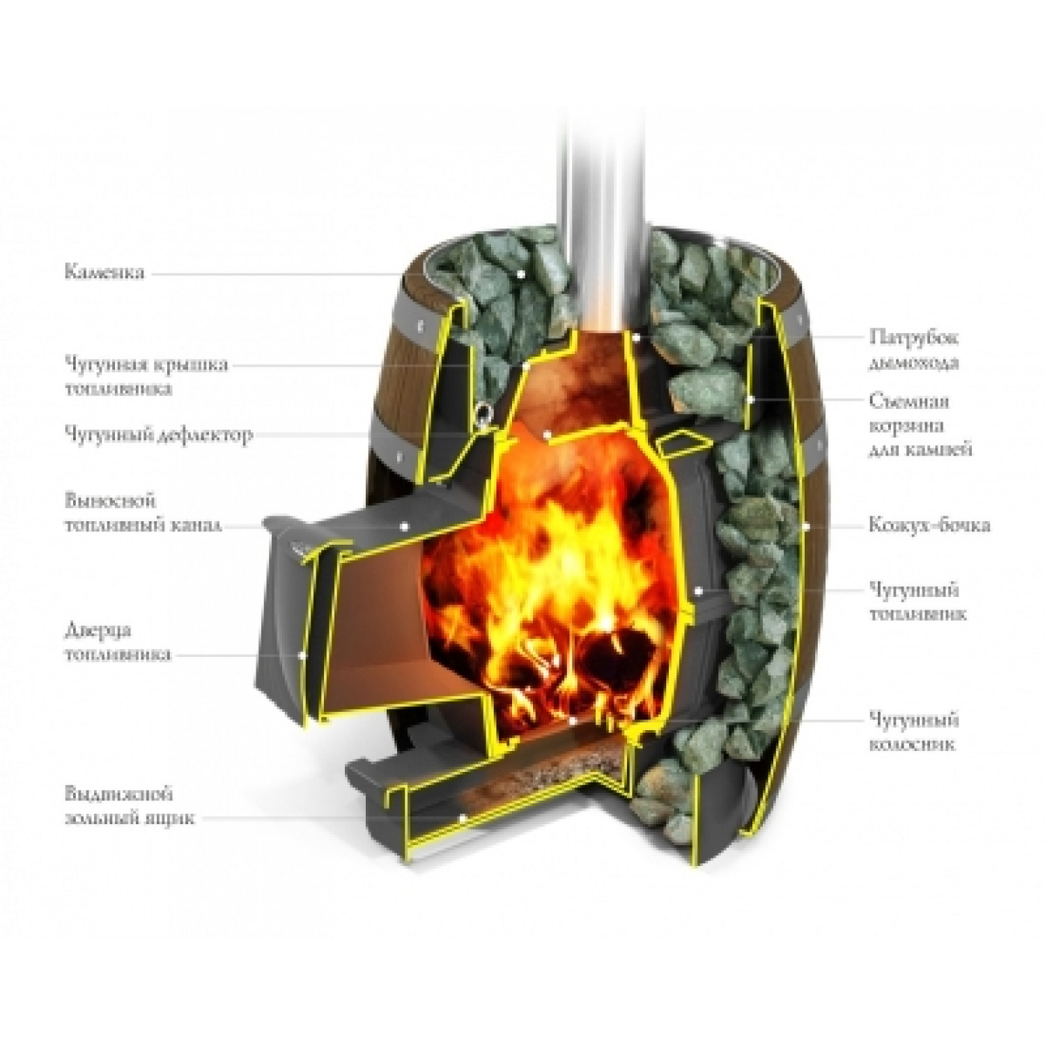 Печь состоит из двух основных элементов: - это топливник, выполненный из сборного литейного чугуна, и наружный кожух для размещения каменной закладки, стилизованный под деревянный бочонок.