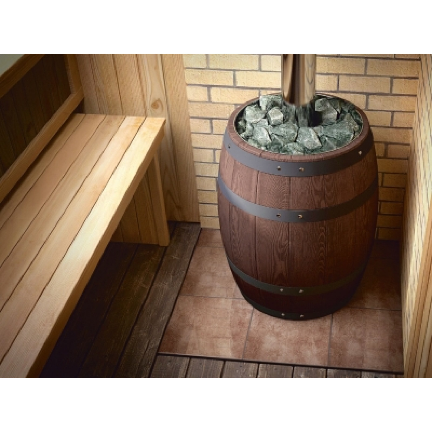 Дизайн печи в виде бочонка очень органичен для интерьера любой бани. Бочка, стоящая в бане – это очень естественно, просто и узнаваемо с незапамятных времен.